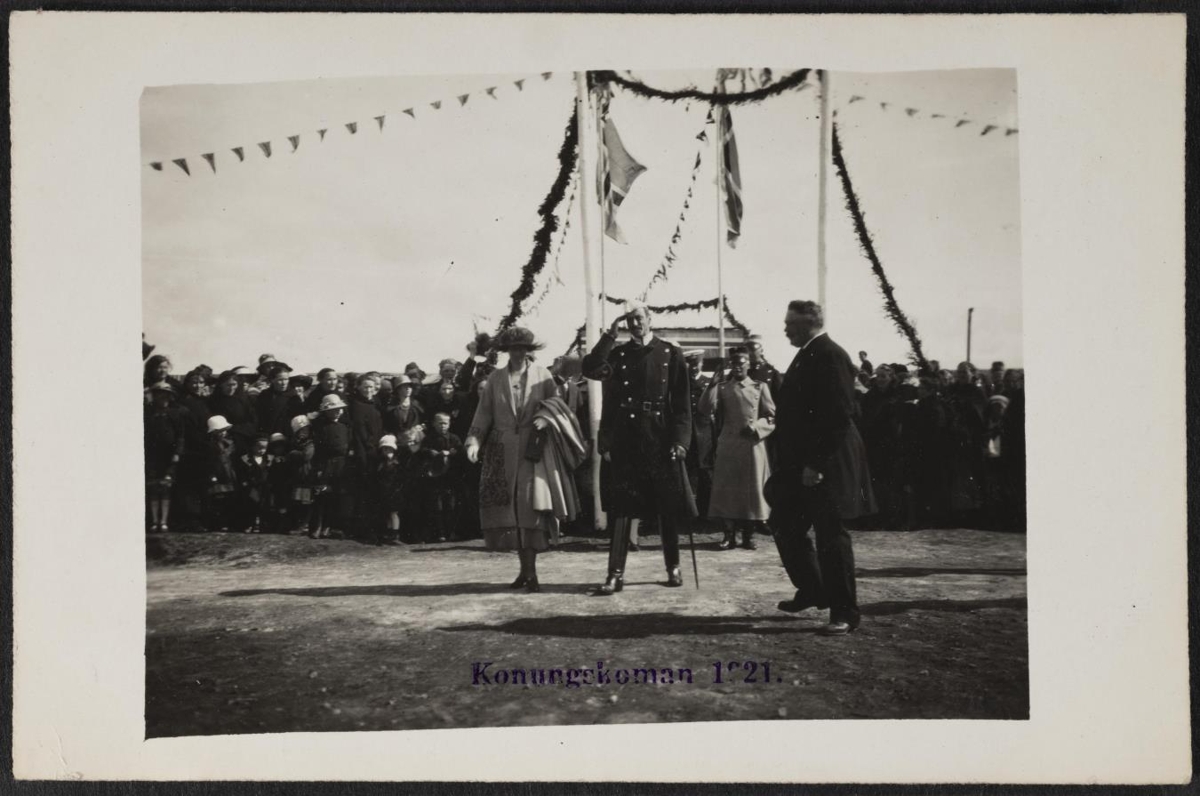 Myndin sýnir mannfjölda fylgjast með konungshjónunum og gestgjafa þeirra við opinbera móttöku. Yfir mannfjöldanum gnæfir fánaskreyting.