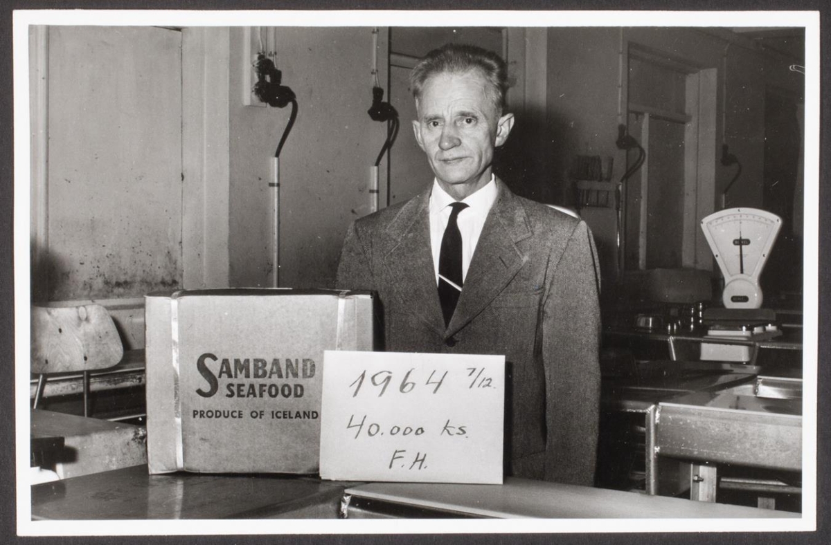 Samband Seafood ásamt dagsetningu og ártali. Karlmaður stendur hjá.