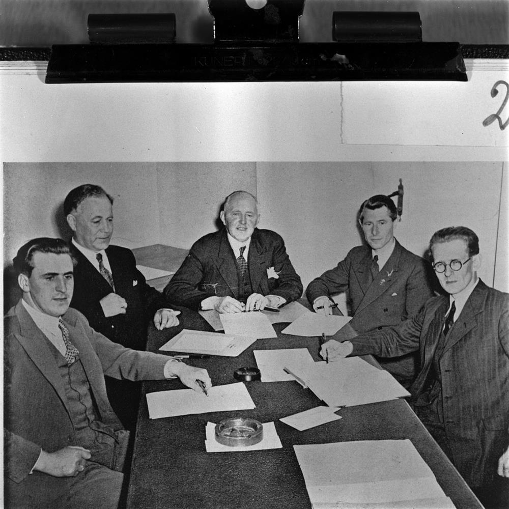 Fimm karlmenn í jakkfötum sitja við fundarborð. Á borðinu eru ýmsir pappírar og öskubakkar.