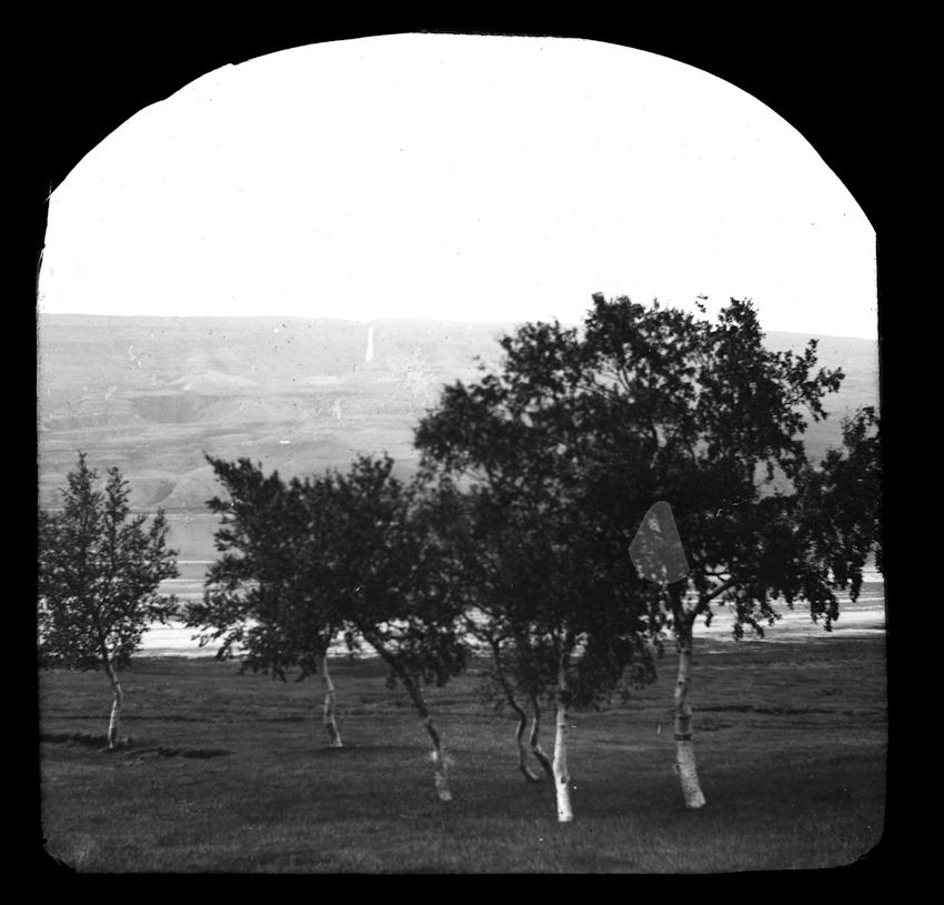 Stakar hríslur á sléttri grund. Vatn í baksýn og handan þess hlíð og fjall og sér móta fyrir fossi niður af fjallsbrúninni. „Á Selareyri við Lagarfljót – Hengifoss.”