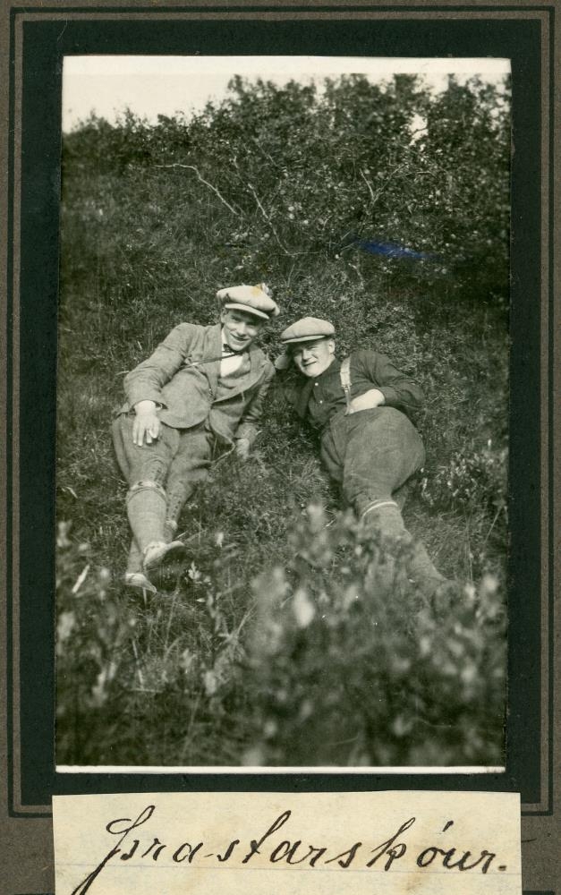 Tveir menn í hnébuxum og háum sokkum með derhúfur liggja í kjarrlendi. Óskar Þ. V. Sveinbjörnsson og Helgi. Undir myndina er skrifað Þrastarskóur.