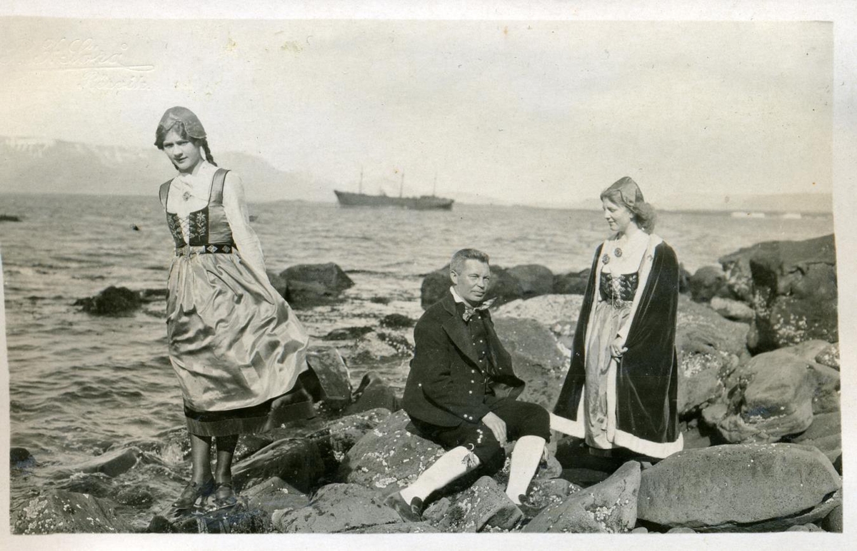 Karl í norskum þjóðbúningi situr á steini í fjöru. Hjá honum standa tvær stúlkur á upphlut og er önnur í kirtli yfir en báðar eru með sérstakt höfuðfat við búninginn. Svanhildur t.v. Samkvæmt skrásetningu sömu mynda í Ljósmyndasafni Reykjavíkur er maðurinn Peter Sørå sjálfur.