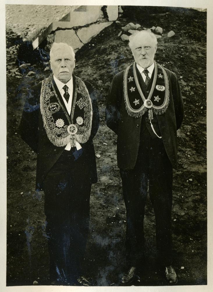 Tveir eldir menn með útsaumaða kraga um hálsinn, með táknum. Væntanlega merki stórtemplara.