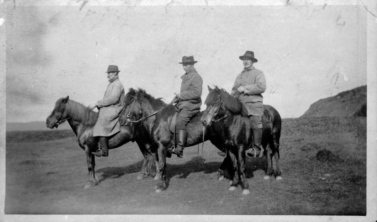 hatta á höfði og í reiðstígvélum. Þeir eru á flatlendi en í baksýn t.v.
