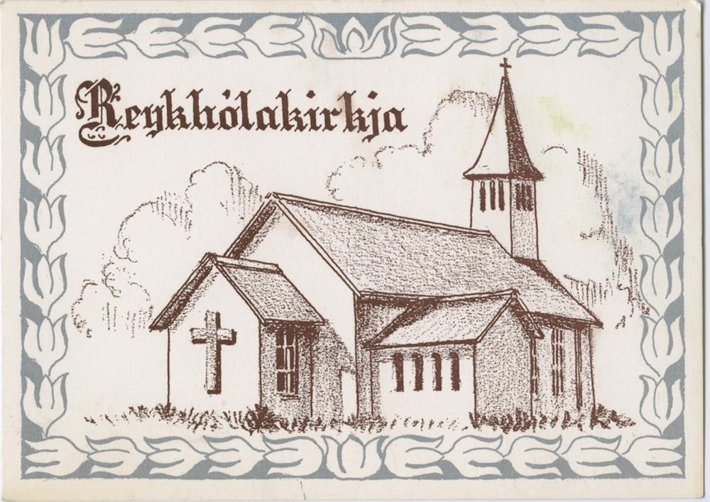 Grafíkmynd af nýlegri steinkirkju, stór kross á gafli skrúðhússins. Ofanvið stendur: Reykhólakirkja. Skrautmunsturborði umhverfis.