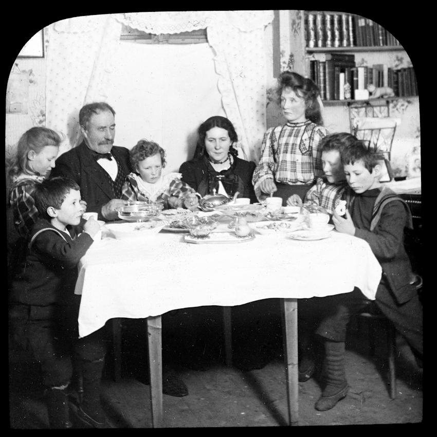 Hjón með sex börn sitja við kaffiborð. Bollar, diskar, ketill og diskar með bakkelsi á dúkuðu borði. Gluggi á bak við hjónin hefur verið byrgður til að birtan kæmi ekki á móti myndavélinni. Bókahillur.