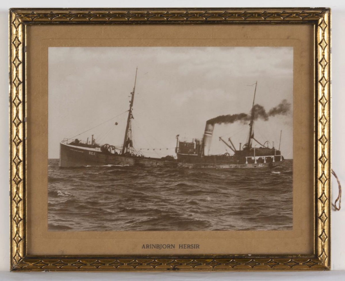 Innrömmuð ljósmynd af togaranum Arinbirni hersir RE 1. Skipið var smíðað í Englandi 1917 og var 321 brl. stálskip með 550 ha. gufuvél. Eigandi var h/f Kveldúlfur frá árinu 1922. Selt 27. júní 1944 Óskari Halldórssyni, Guðríði Ernu Óskarsdóttur og Guðrúnu Óskarsdóttur, Reykjavík, skipið hét þá Faxi RE 17. Selt 29. nóv. 1944 Hlutafélaginu Faxakletti, Hafnarfirði. Skipið var selt til niðurrifs og tekið af skrá 27. sept. 1952. Ekki kemur fram á skráningarspjaldi hvort myndin er í lit eða svarthvít.