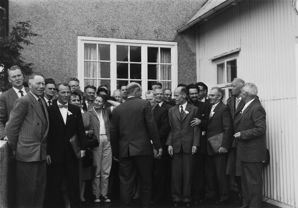 Flestir á þessari mynd hafa áður verið kynntir á þessum blöðum en því má bæta við að hávaxni maðurinn, lengst til vinstri, er Sigurður Blöndal, skógræktarvörður á Hallormsstað og þriðji maður fra hægri, roskinn með gleraugu, er Björn Guðmundsson, sem lengi var forstjóri Grænmetisverzlunar ríkisins, og næstur honum í fremstu röðinni, er Þóroddur Guðmundsson, skáld frá Sandi í Aðaldal, er með skalla. (Kjartan Ól. 2019)