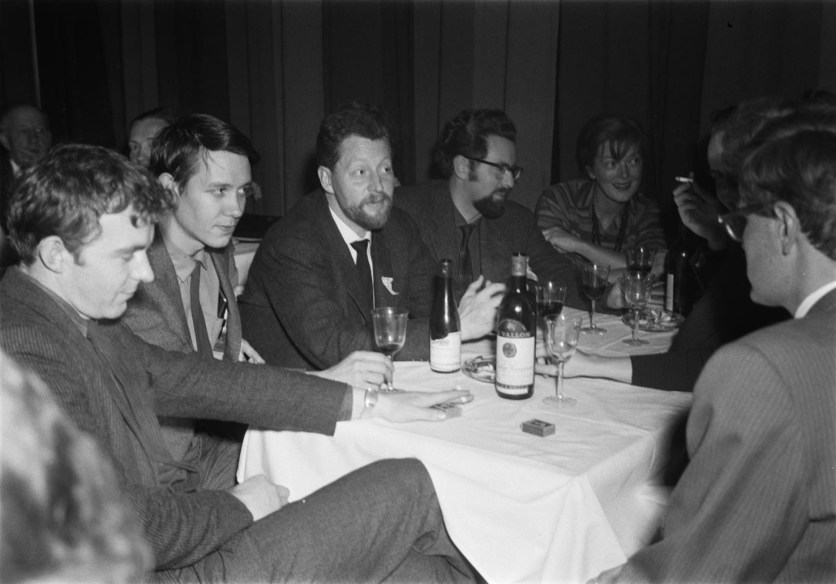 Talið frá vinstri: Steinþór Sigurðsson listmálari, Kjartan Ólafsson, Thor Vilhjálmsson, Sigurjón Einarsson, Jóna Þorsteinsdóttir, Hreinn Steingrímsson, sést ógreinilega, og Sigurður Örn Steingrímsson. (Kjartan Ól. 2022)