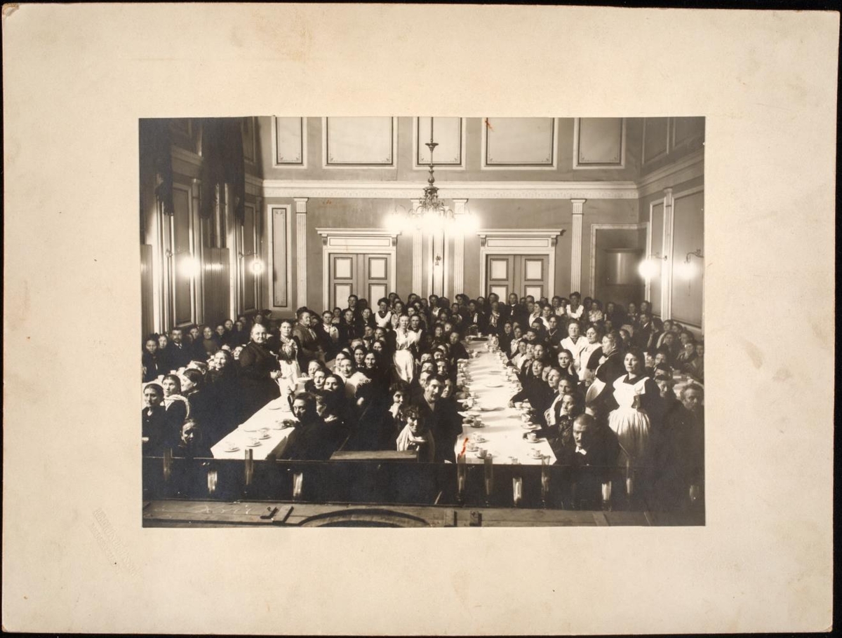 Hópmynd af gamalmennaskemmtun Thorvaldsenfélagsins í Iðnó. Þórunn Jónassen landlæknisfrú stendur lengst til vinstri á myndinni. Sama mynd og Mms-16199.