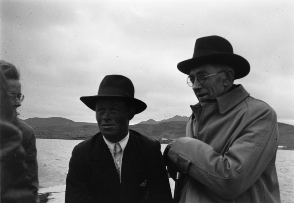 Tveir karlmenn með hatta. Vatn og fjall í baksýn.