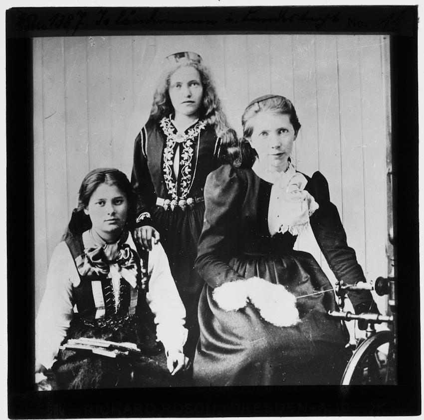 30. Konur í íslenskum þjóðbúningum; upphlut, skautbúning og peysufötum. Sér í rokk lengst t.v. og er ein kvennanna að spinna á hann og með ullarkembu í kjöltu sér. Önnur þeirra er með kamba liggjandi í kjöltu sér. Sigurlaug Erlendsdóttir prestfrú á Torfastöðum t.h.