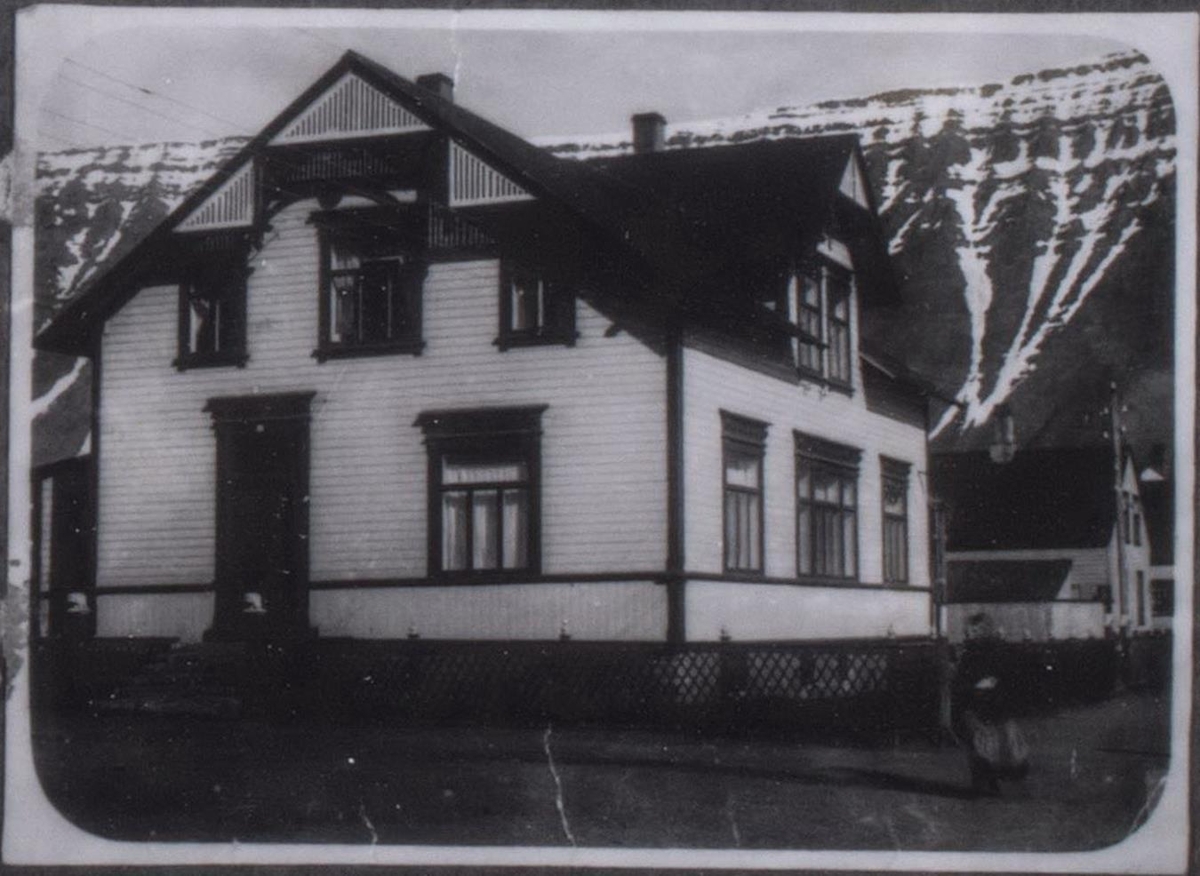 Eftirtka. Myndin sýnir reisulegt íbúðarhús úr timbri, hæð og ris. Á götunni framanvið er kona á gangi, í baksýn fleiri hús og svo há og brött fjallshlíð.
