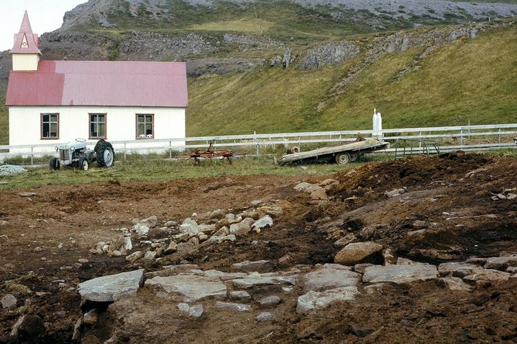frá suðri, kirkjan sést.