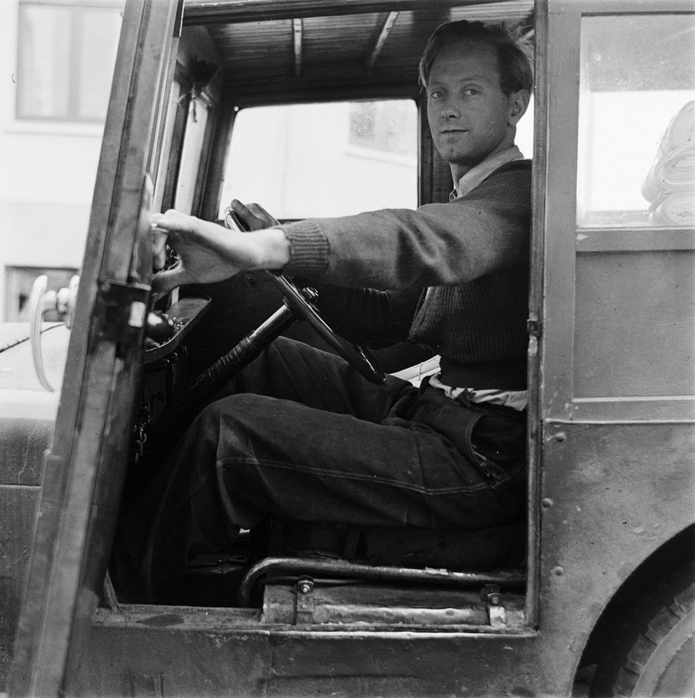 Karlmaður situr við stýri á bíl, bílhurðin er opin og hann heldur í handfangið á hurðinni. Hann er klæddur gallabuxum, skyrtu og peysu eða gollu. Hann er með hökuskarð.