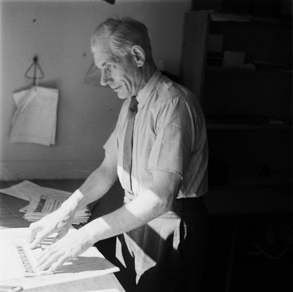 Eldri karlmaður stendur við borð í prentsmiðju Þjóðviljans. Á borðinu fyrir framan hann er eintak af Þjóðviljanum, fyrir aftan hann er stafli af eintökum. Hann er klæddur stutterma skyrtu og bindi.