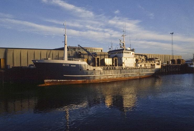 Hilmir SU-171 við bryggju í Reykjavík. Víð mynd. Ljósm: ? Mars, 1982.