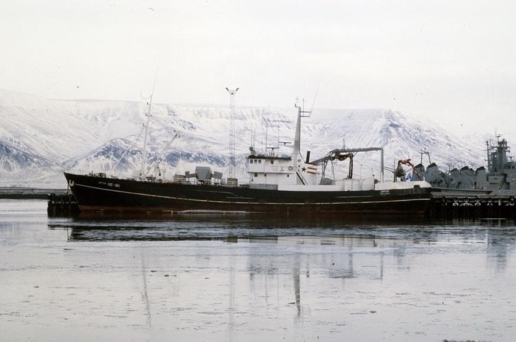 Júpíter RE-161 við bryggju í Reykjavík. Sér á hlið skipsins. Víð mynd. Ljósm: ?