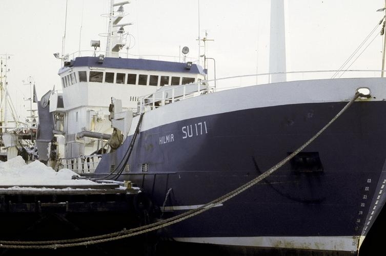 Hilmir við bryggju. Sér á stefnið og aftur eftir skipinu. Þröng mynd. Ljósm: ? Jan., 1984.