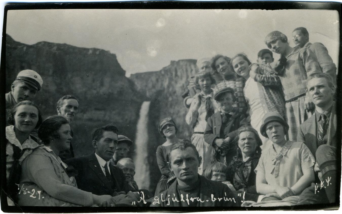 fellur allmikill foss. Á myndina(filmuna) er skrifað: 7/8-27. "Á gljúfra-brún"!