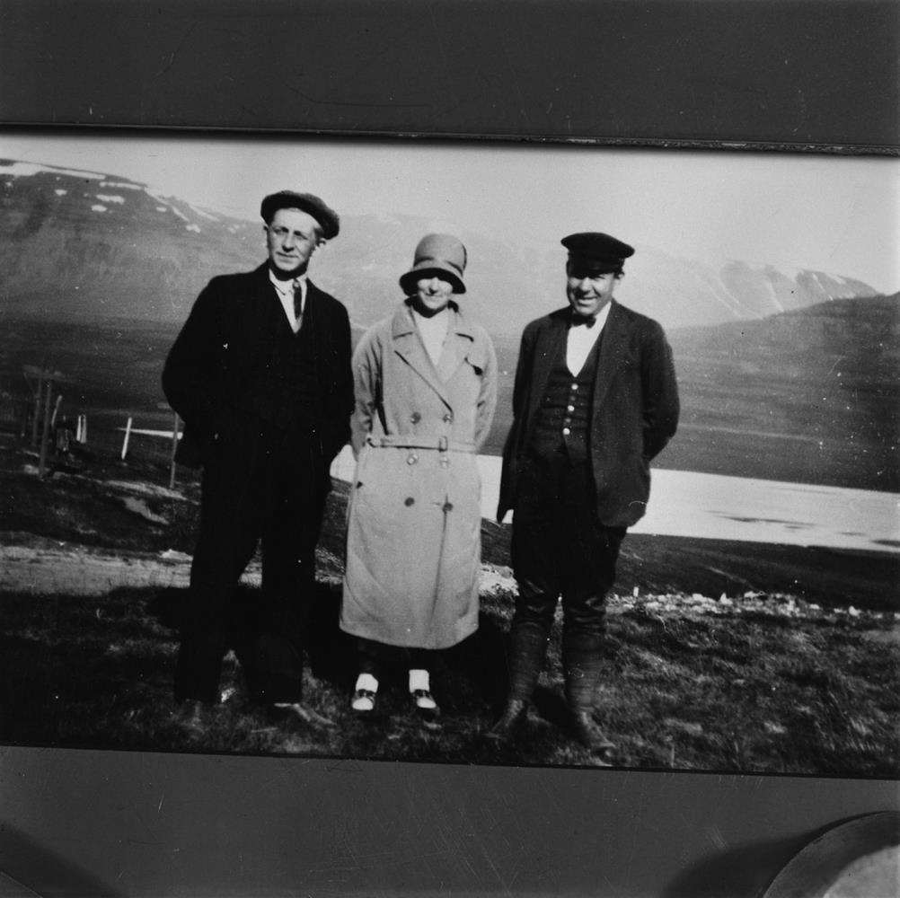 Tveir karlmenn og kona stilla sér upp fyrir mynd utandyra. Í baksýn eru fjöll og vatn eða sjór. Maðurinn til hægri er sennilega Jón Guðmann Gíslason.