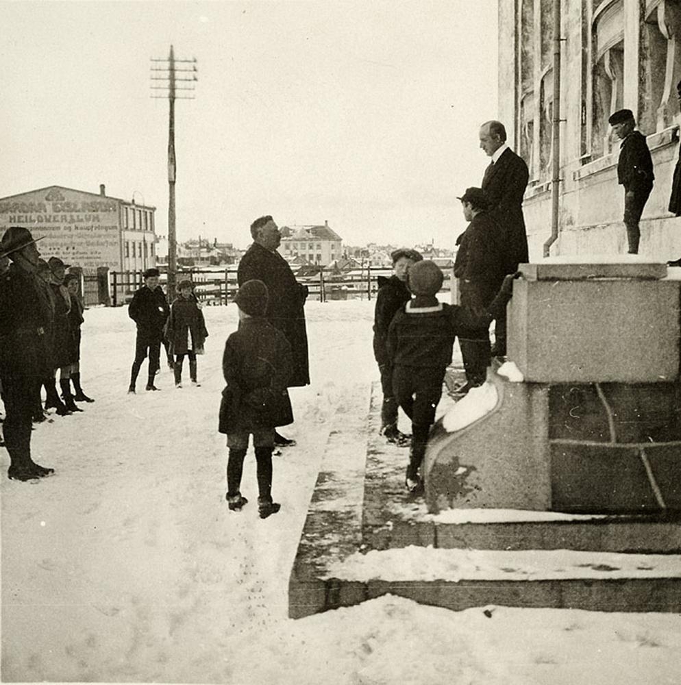 Menn við tröppur, annar neðan við, en hinn á þeim. Börn standa hjá. Fjær skátar í röð. Hús í baksýn.
