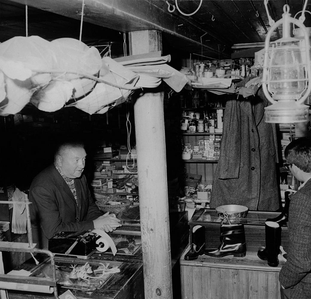 krambúð og sýnir kaupmanninn bakvið búðarborðið og annann karlmann yst