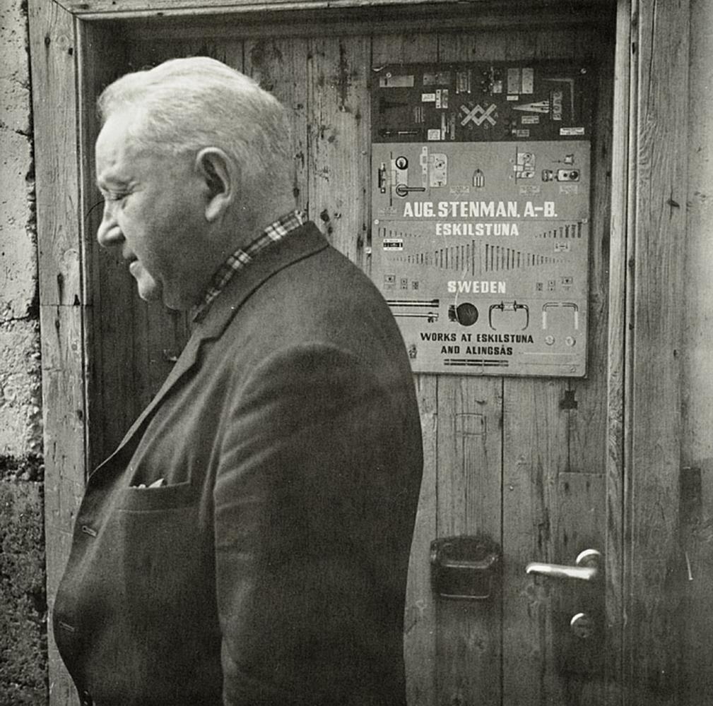 framan dyr sem á er fest skilti; á því stendur: Aug. Stenman. A.B. / Eskiltuna