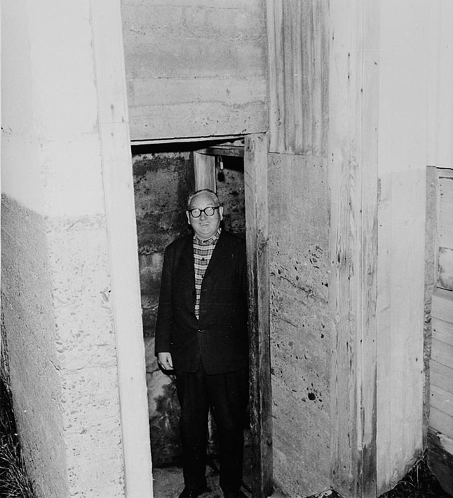 standa í dyragætt í kjallara steinhúss.