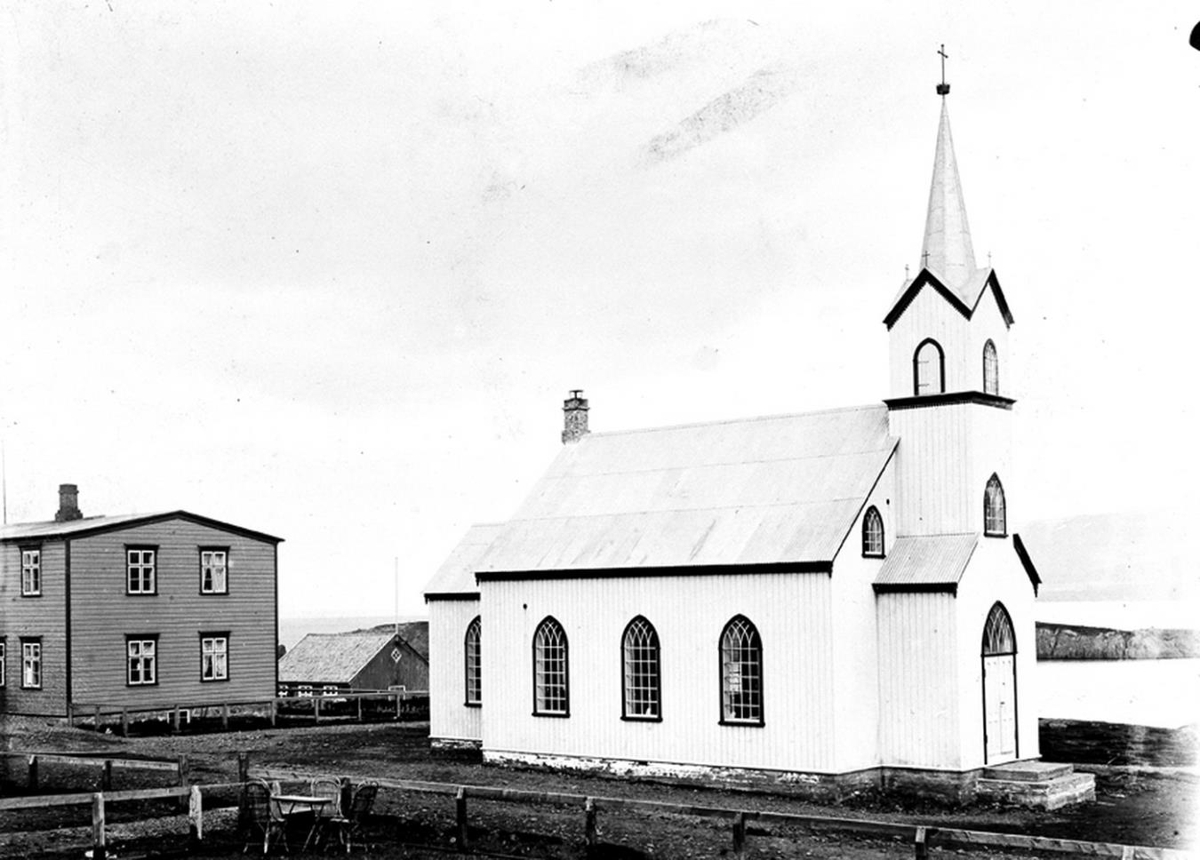 nýlegt að sjá. Á milli kirkjunnar og hússins sést í fleiri hús.