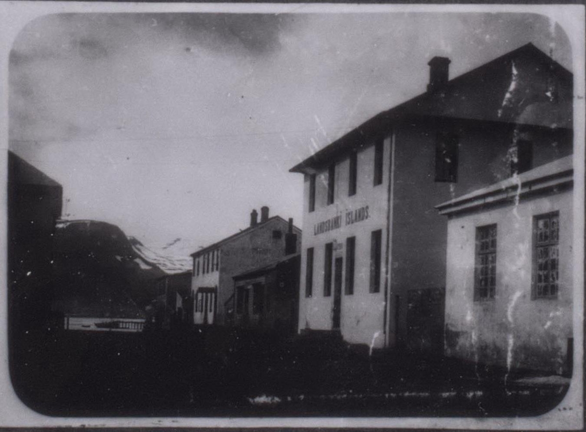 Eftirtaka. T.h. í mynd er húsaröð við götu og eru húsin ýmist eins eða tveggja hæða. Framaná stærsta húsinu stendur: "Landsbanki Íslands" og ártal undir, ólæsilegt. Bryggja, bátur og fjall í baksýn.