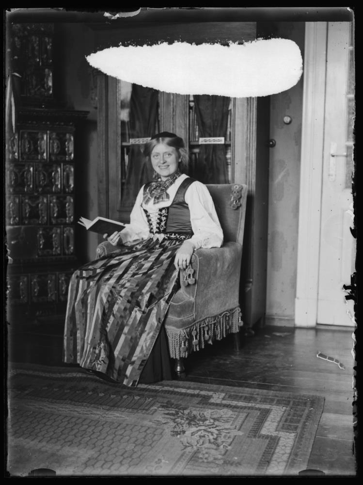 Ung kona á Peysufötum sitjandi í stofu.