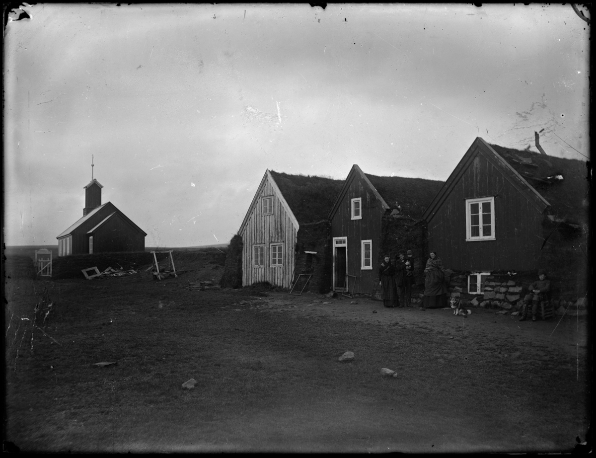 Torfbær í sveit og krikja fjær. Fólk stendur á bæjarhlaðinu. Það er heimilisfólkið: Magnús Andrésson og Sigríður Pétursdóttir með son sinn Andrés og hjá þeim stendur Sólveig Eymundsson kona ljósmyndarans. Daníel bróðir hennar situr fjær.