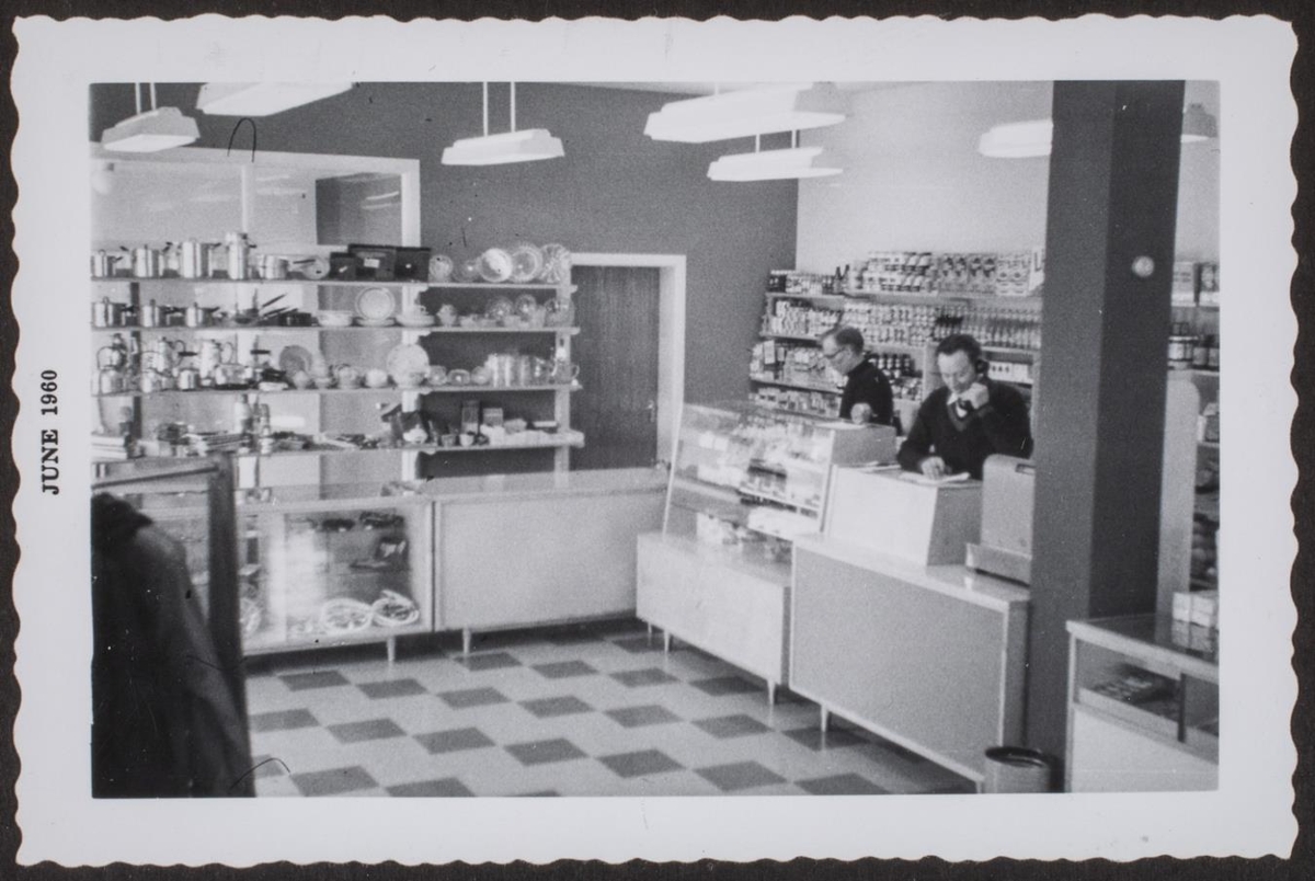 „Tveir menn við afgreiðslu, til hægri Ottó Björnsson innanbúðar maður til mjög margra ára og maður til vinstri er Jónas Einarsson kaupfélagsstjóri einnig til margra ára.“ (JÓV 2023)