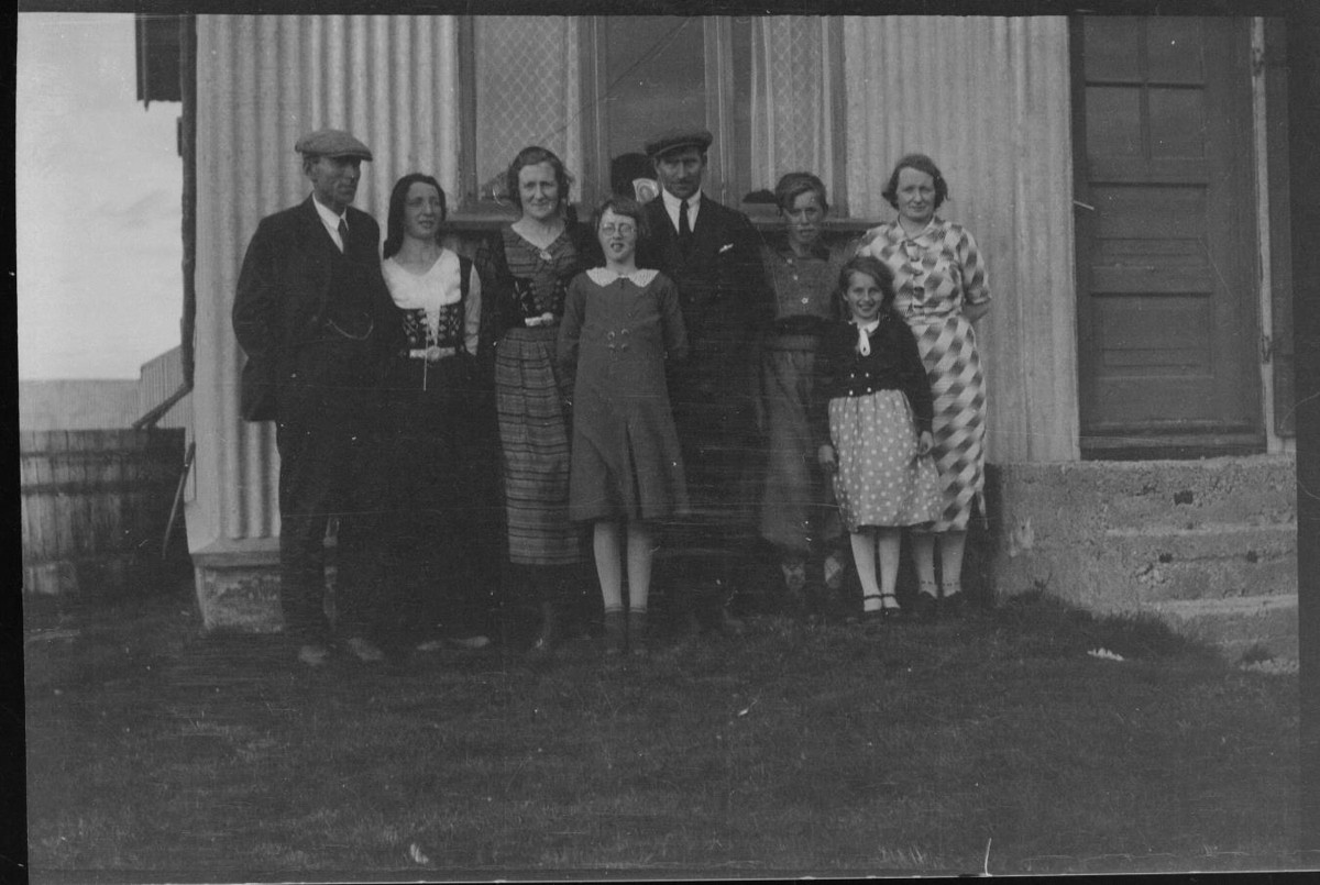 Fólk við húsvegg. Hér má þekkja Þórarinn Guðmundsson bónda