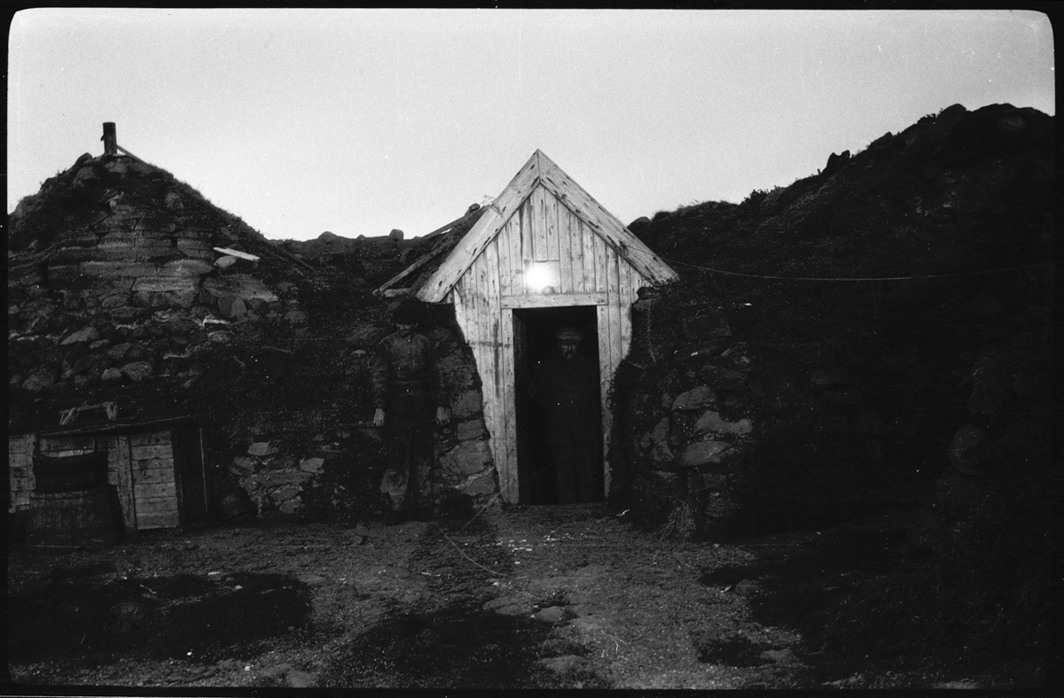timburgafl á miðburstinni. Maður stendur í dýragátt og annar utan