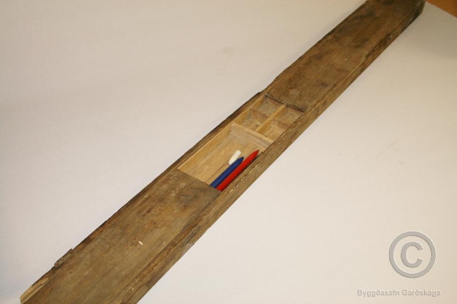 Pennastokkur með tveimur lokum ofan sem er rennt til þegar opna á stokkinn. Mörg hólf eru í stokknum fyrir margskonar hluti. Gefandi og eigandi stokksins var Hreinn Guðbjartsson (1938 - 2022) sem bjó lengi í Garðinum.