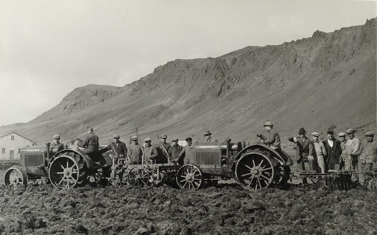 aftaní. Handanvið vélarnar hefur hopur karlmanna raðað sér upp til myndatökunnar.