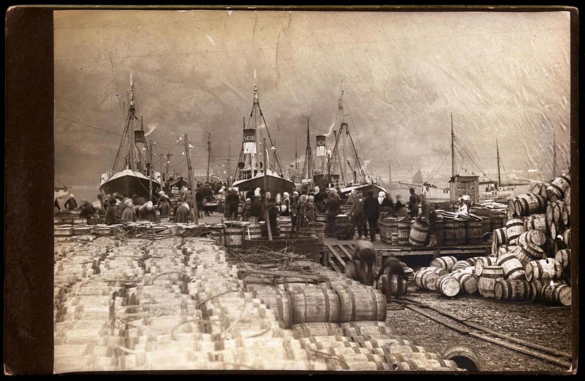 Síldarsöltun á bryggju. Tunnur í forgrunni, skip í baksýn ?, RE 151, RE 114. Togarinn til vinstri er Ýmir GK 448. Það tímasetur myndina til annaðhvort sumarsins 1915 eða 1916, en það eru einu árin þegar þessi skip voru saman á síld.