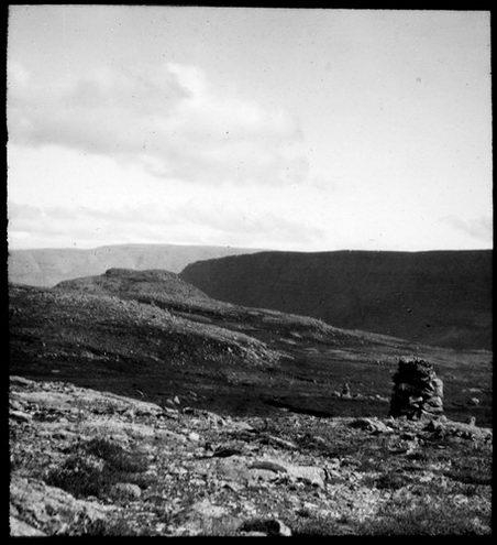 36. Tunguheiði milli Tálknafjarðar og Arnarfjarðar. Gróðursnauð og grýtt fjallendi. Hlaðin varða til hægri.