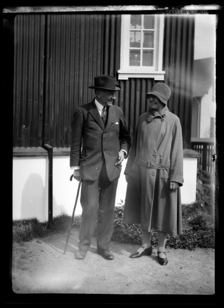 Karl og kona við bárujárnsklætt hús. Oluf Krabbe og Margarethe Krabbe.