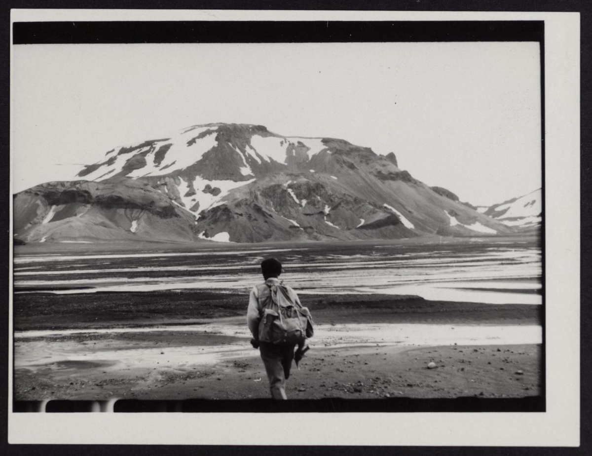 jarðfræðingur horfir í áttina til fjallsins, en hann hefur haft yfirumsjón