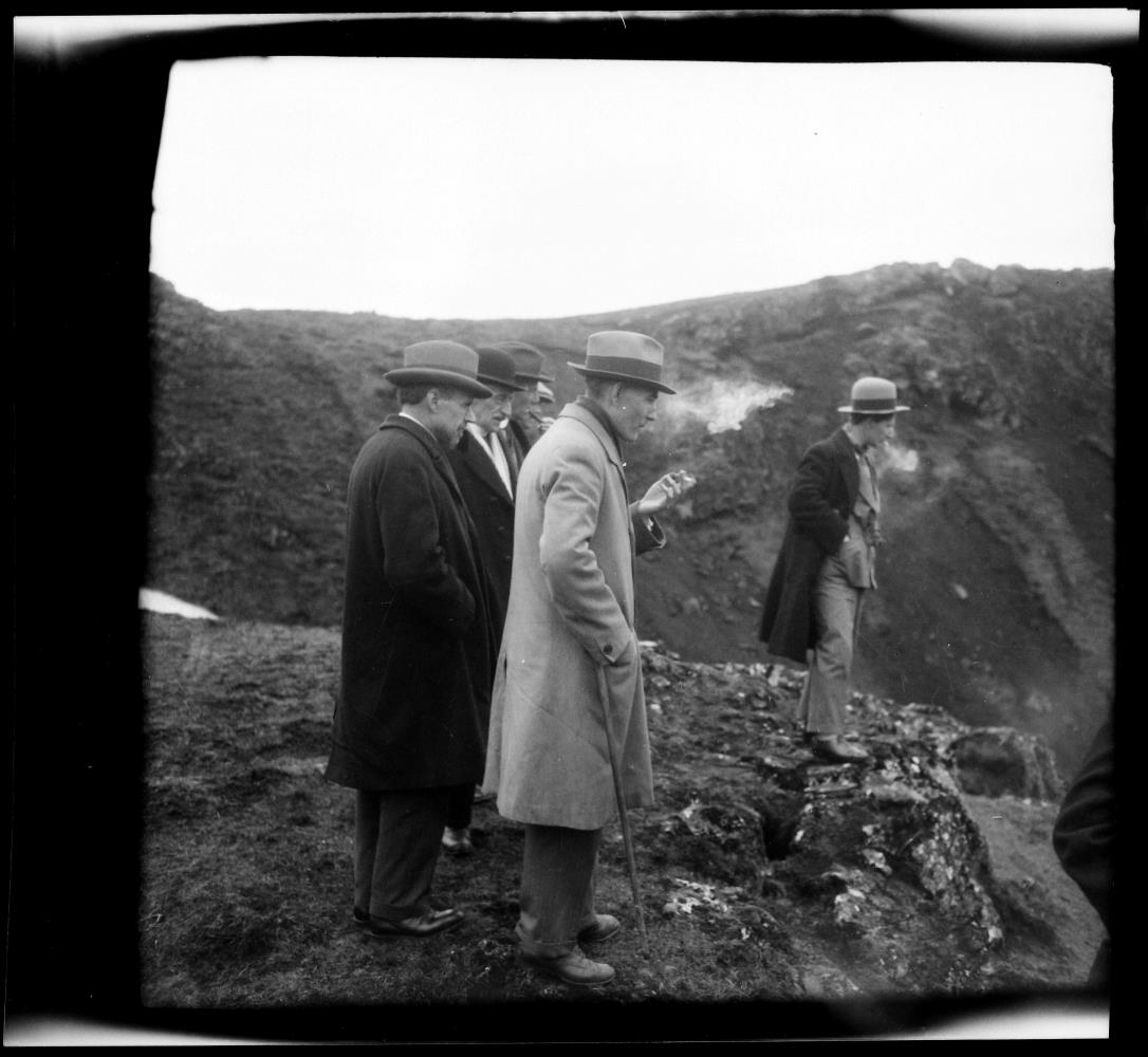 stendur á barmi gígs. Einar Arnórsson ráðherra fremst.