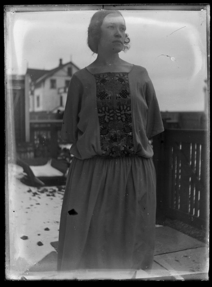 Kona stendur á stétt við hús í kjól með innfelldri blúndu á efri parti