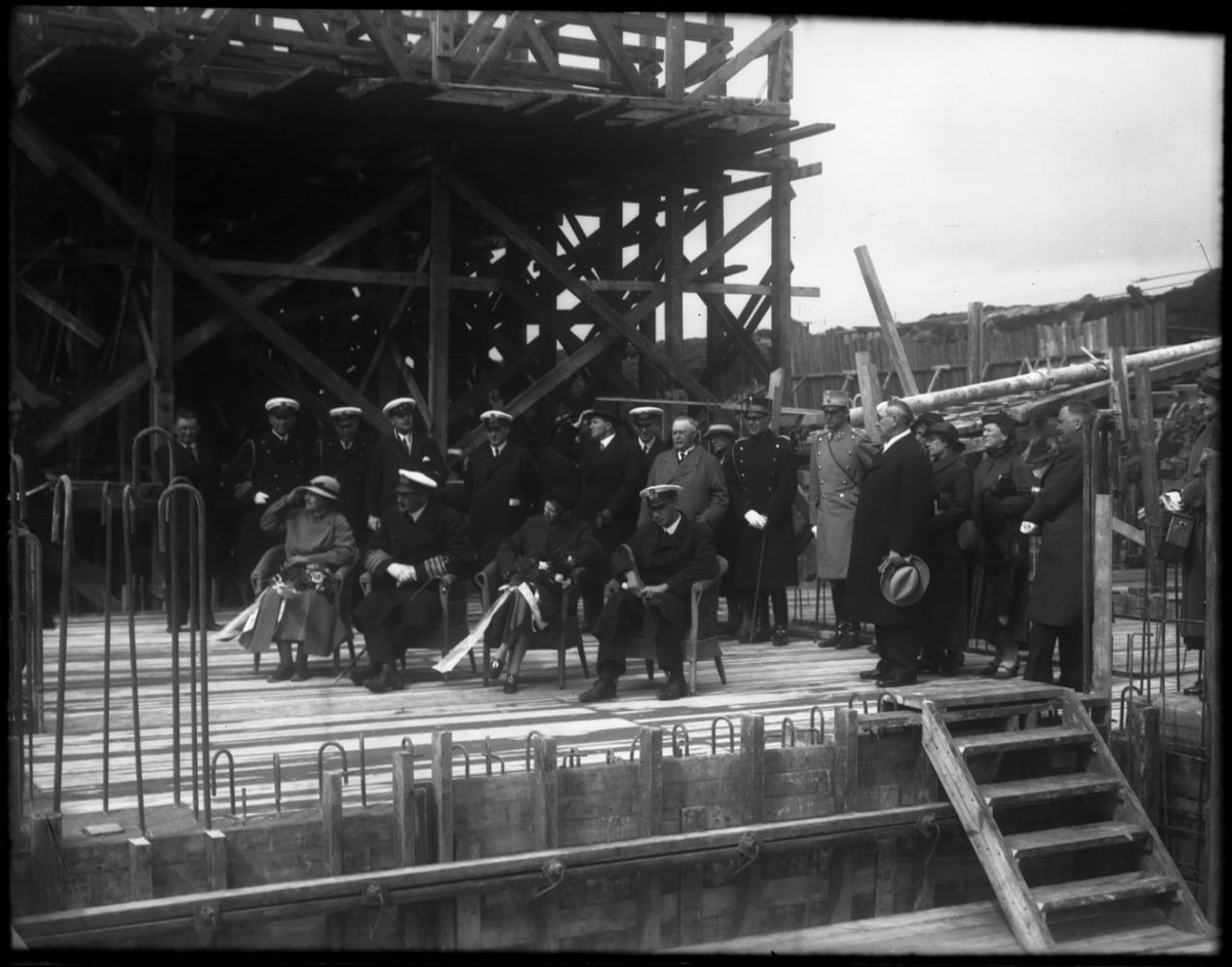 Fremst sitja Kristján X, drottning og tveir aðrir. Steypustyrktarjárn stendur