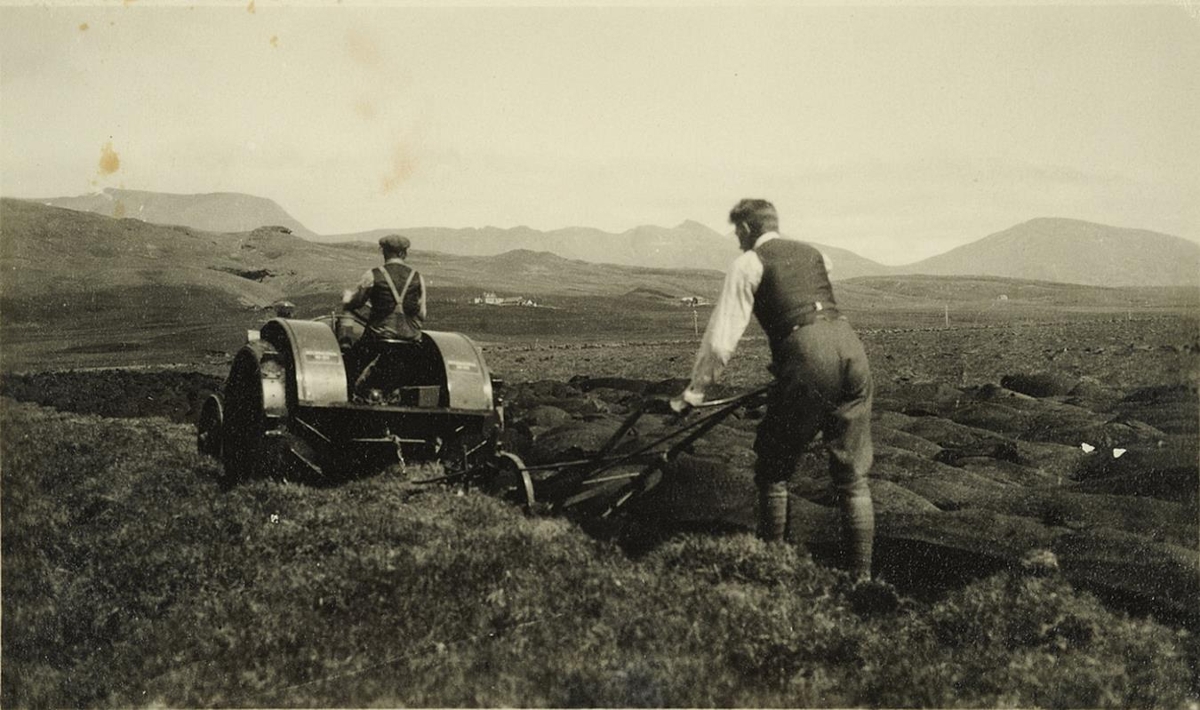 plóg sem stjórnað er af karlmanni. Í baksýn er dalur og lág hlíð þar sem