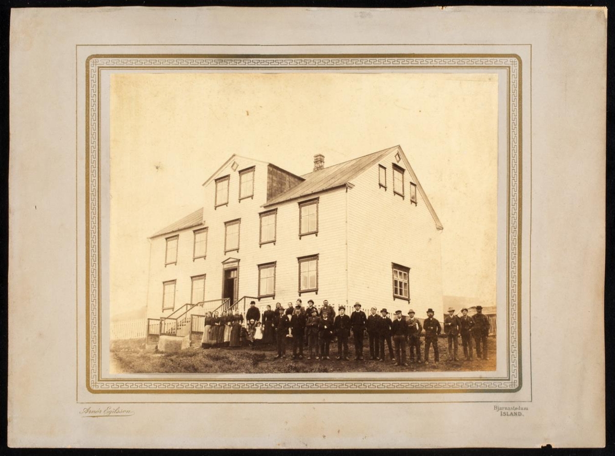 Hólaskóli. Eldra skólahúsið úr timbri. Margt fólk stendur fyrir utan, þ.á.m. Hermann Jónasson, skólastjóri.
