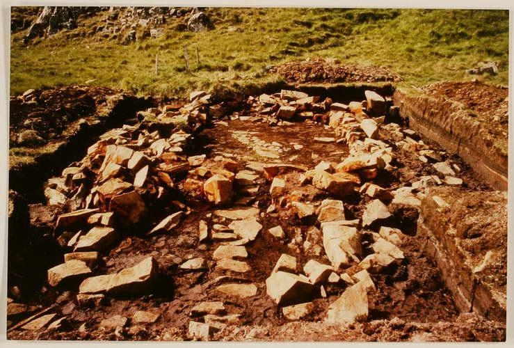 Horft yfir rúst undir grunnu jarðvegslagi sem grafið hefur verið ofanaf. Smáþýfðir móar umhverfis.
