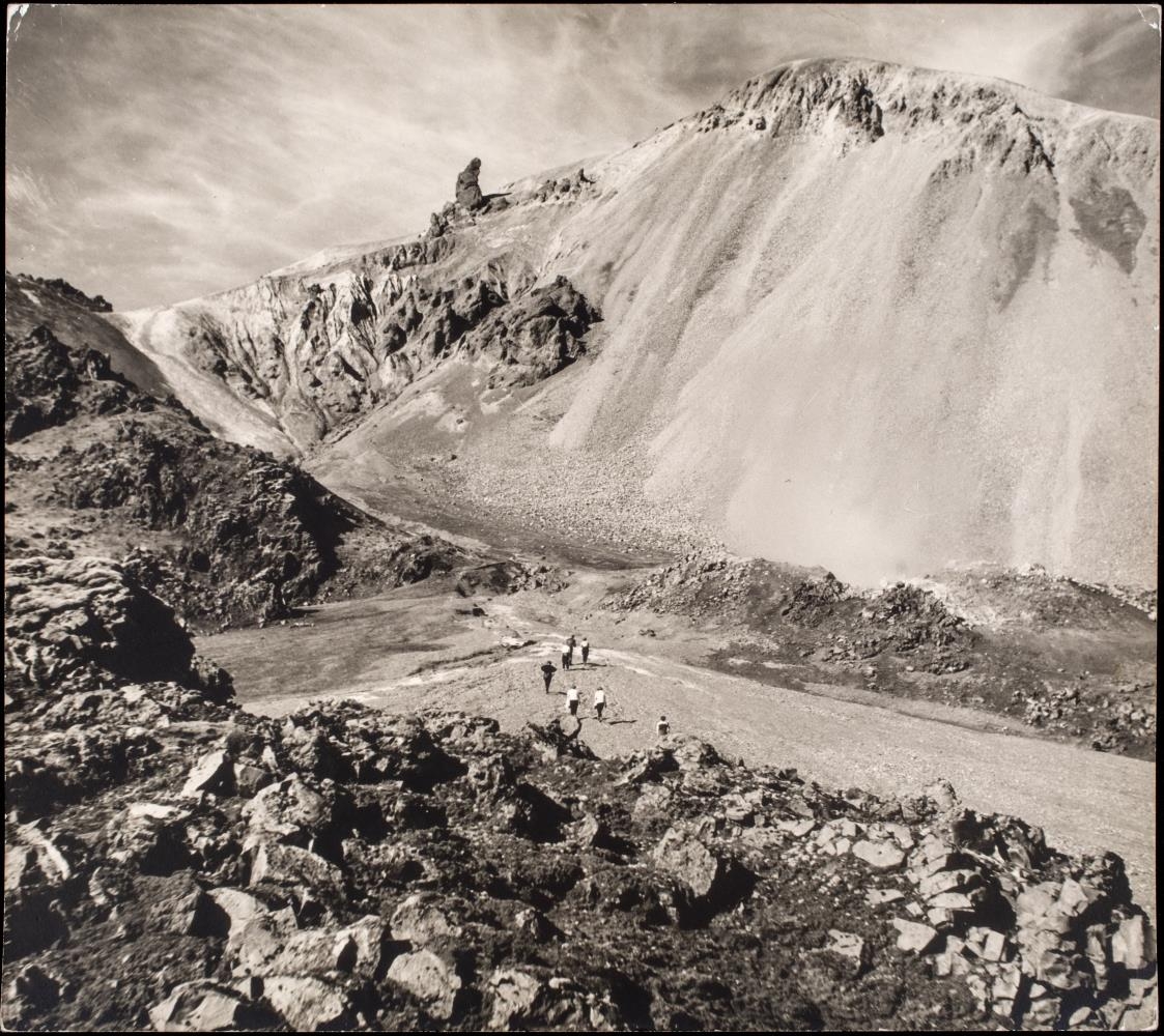Ferðafólk á gangi fyrir miðri mynd inn eftir dalverpi þar sem heitir Brennisteinsalda. Fjallshlíð sem mikið hrynur úr af smáu grjóti í bakgrunni og stórgrýtisskriða í forgrunni. Símanúmer ljósmyndara og nafn stimplað aftan á mynd. -