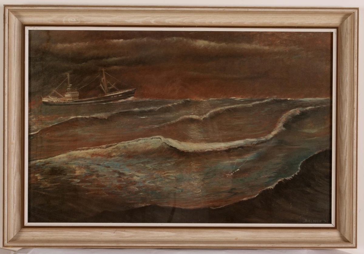 Innrammað myndverk, akryl? eftir Baldvin frá 1970. Myndin er af togaranum Maí GK 346. Aftan á bakhlið myndarinnar er skrifað MARK 61.